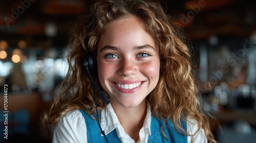 A cheerful woman wearing a headset in a vibrant café smiles warmly, embodying friendliness and readiness to assist customers, with a stylish and inviting background.