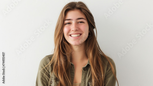 A cheerful woman with wavy hair and freckles smiles warmly, wearing a casual denim shirt against a light background.
