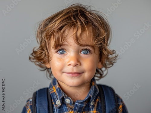 A cheerful young boy with curly hair smiles at the camera while wearing a checkered shirt