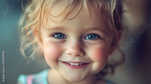 A cheerful young girl with curly hair and bright blue eyes beams happily, enjoying the moment in a cozy indoor environment filled with warm light