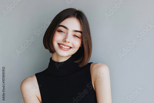 A Cheerful Young Woman Wearing a Black Sleeveless Top Smiles Against a Light Background