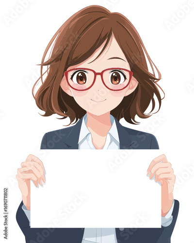 A cheerful young woman with brown hair and glasses stands in a professional outfit, presenting a blank sign. Her joyful expression invites engagement and curiosity in a bright, simple background.