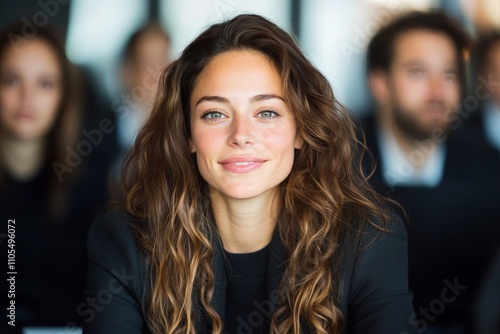 A cheerful young woman with curly hair sits confidently, looking directly at the camera, surrounded by blurred colleagues in a professional, modern office environment.