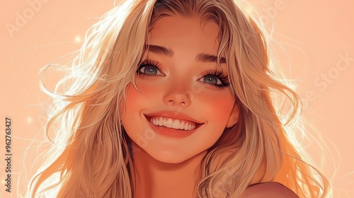 A cheerful young woman with long, flowing blonde hair and a bright smile against a soft, warm background, radiating positivity and joy.