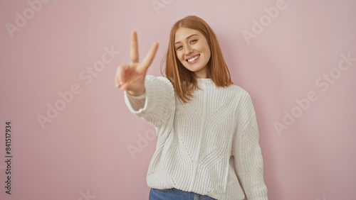 A cheerful young woman with red hair in a white sweater making a peace sign over a pink background