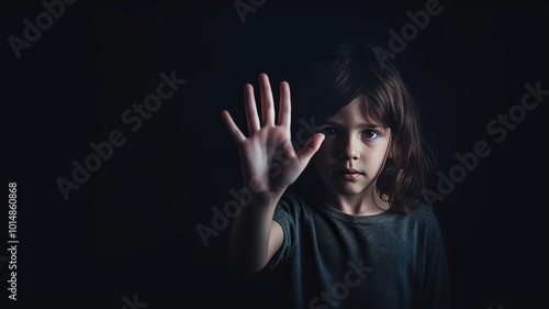 A child girl hand raise hand cover for stopping , fearcore, dark environment .Child abuse. Girl making stop gesture