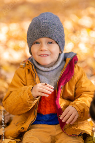 A child rejoices playing with a ladybug in an autumn park. Happy childhood