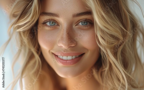 A close up of a multiracial woman with striking blue eyes looking directly at the camera