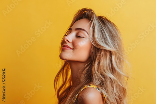A close up of a woman's face with her eyes closed and long blond hair