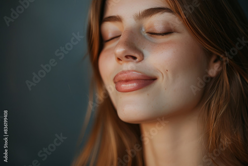 A close up of a woman's face with her eyes closed looking to a side