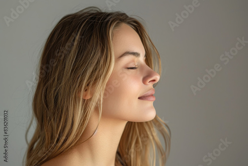 A close up of a woman's face with her eyes closed looking to a side