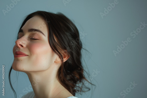 A close up of a woman's face with her eyes closed looking to a side