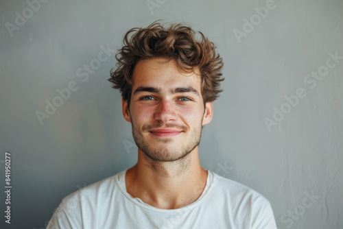 A close up portrait of a young man with a subtle smile