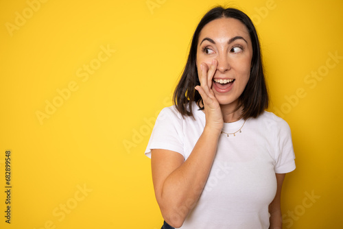 A close up portrait of a young pretty woman telling secret information, holding her hand near mouth and standing against yellow background