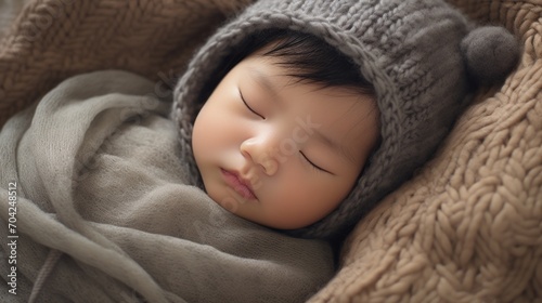 A close-up of a cute sleeping Asian newborn baby swaddled in a gray blanket and wearing a knitted teddy bear hat lies on the bed. Multiethnic children, Family, new life concepts.