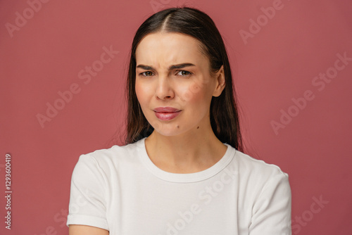 A close-up of a person with a confused expression, dressed casually, against a pastel pink backdrop. Perfect for emotional and expressive content related to confusion or consideration.