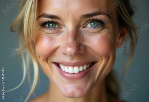 A close-up of a woman smiling, showing her white teeth.