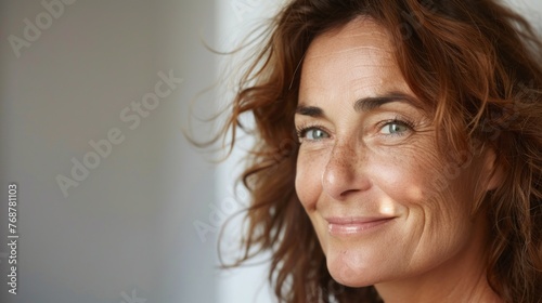 A close-up of a woman with a warm smile radiant skin and soft wavy hair exuding a sense of joy and contentment.