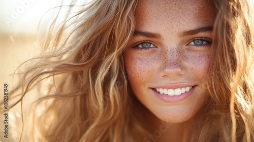 A close-up of a woman with freckles and wavy hair, smiling gently in the golden sunlight, creating a warm and optimistic ambiance of natural beauty and joy.