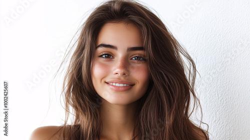 A closeup of a young, attractive brunette woman with long hair, smiling and looking slyly to the side, thinking of a sneaky plan, isolated on a white background