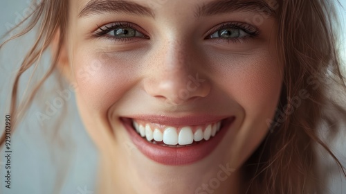 A close-up of a young Caucasian woman with a radiant smile, showcasing her bright eyes and healthy skin.