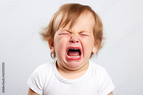 a closeup photo of a cute little baby boy child crying and screaming