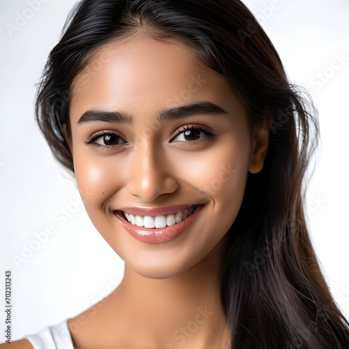 a closeup photo portrait of a beautiful young asian indian model woman smiling with clean teeth. used for a dental ad. isolated on white background.