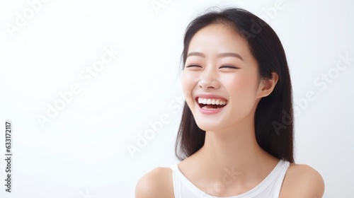 A closeup photo portrait of a beautiful young asian model woman laughing and smiling with clean teeth. used for a dental ad. isolated on white background,