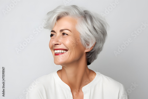 A closeup photo portrait of happy senior woman smiling, with clean teeth, for a dental ad. White background.