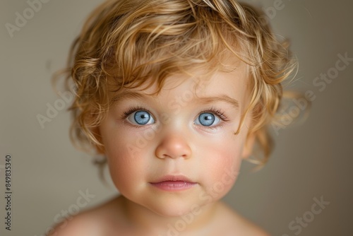 A close-up photograph of a young child with curly blond hair and striking blue eyes, looking directly at the camera with an innocent and inquisitive expression