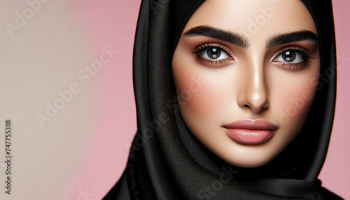 A close-up portrait of a arabic woman with flawless makeup, wearing a traditional black hijab against a pink background