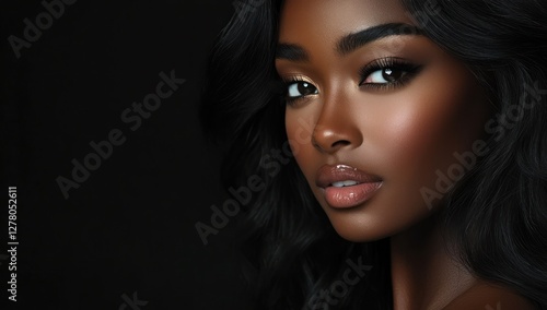 A close-up portrait of a beautiful black woman with long shiny hair and make-up . Haircare, beauty and cosmetics concept.