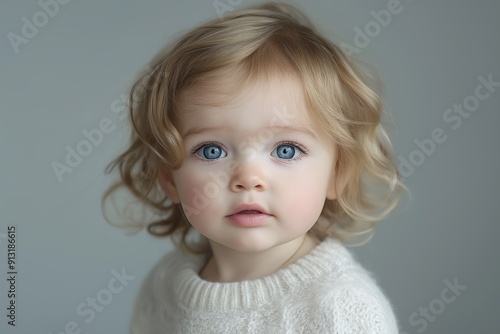 A close-up portrait of a female toddler with curly blonde hair and striking blue eyes, wearing a cozy white sweater