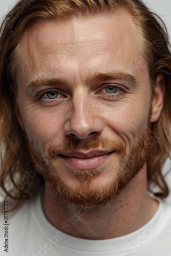 A close-up portrait of a handsome man with long hair, beard and mustache looking at the camera.