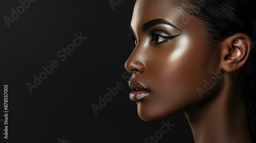 A close-up portrait of a model with striking dark skin and dramatic makeup