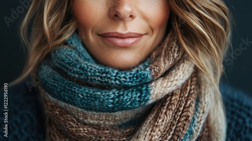 A close-up portrait of a woman showcasing a beautifully knitted scarf, emphasizing texture, warmth, and contemporary fashion aesthetics.