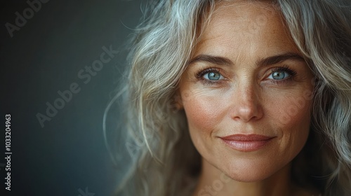 A close-up portrait of a woman with gray hair and bright blue eyes, showcasing natural beauty in soft lighting