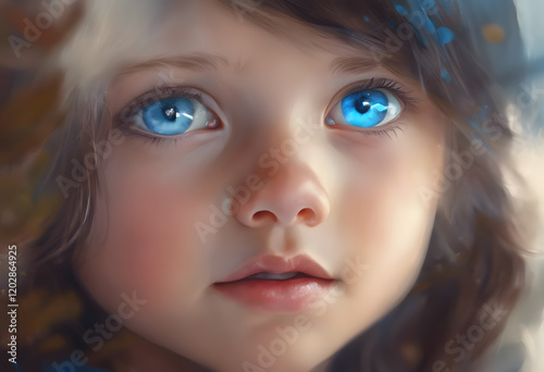 A close-up portrait of a young girl with striking blue eyes and soft brown hair. The background is softly blurred, enhancing her facial features and expression.