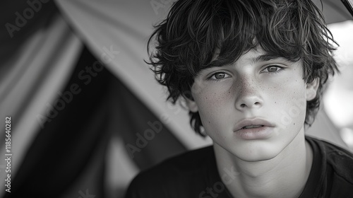 A close-up portrait of a young person with curly hair, gazing thoughtfully, set against a softly blurred background.