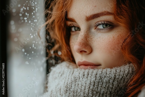 A close-up portrait of a young woman with freckles, gazing out the window on a snowy day.