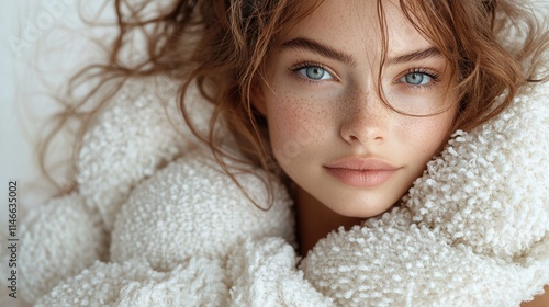 A close-up portrait of a young woman with natural beauty, wrapped in a cozy blanket.