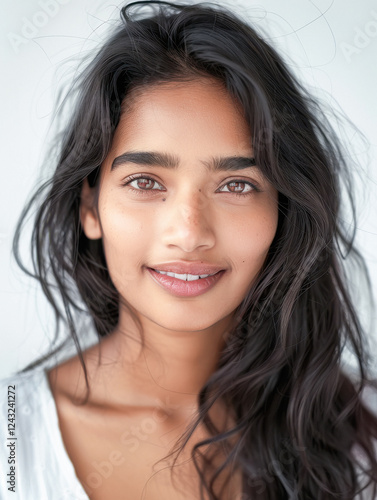 A closeup portrait photo of a young indian woman with unique features, with long wave dark hair