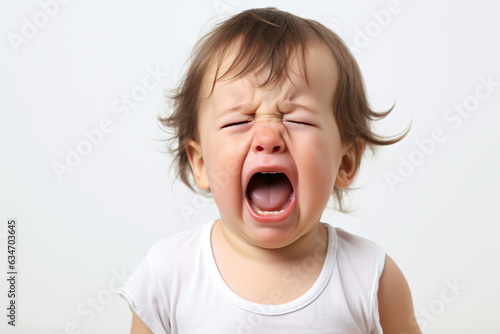 A close-up shot of an adorable baby boy, crying and shouting, isolated on a white background.