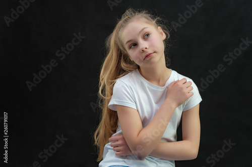 A concept portrait of a cute pretty blonde teen girl with long hair sitting in a white t-shirt against a black background in the studio and talking.