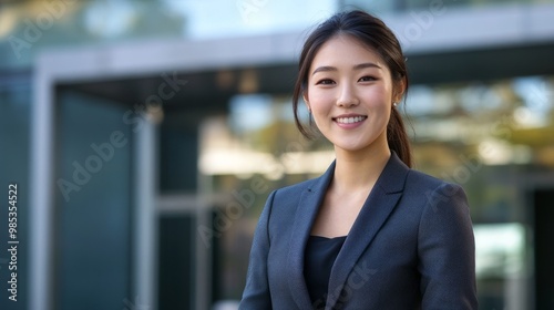 A confident Asian woman in a sleek business suit, smiling outdoors with a modern office building in the background.
