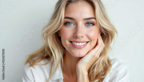 A confident blonde woman with blue eyes and radiant skin, smiling in a white blouse.