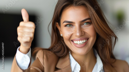 A confident businesswoman beams with a thumbs up, showcasing professionalism in a sleek, modern office setting.