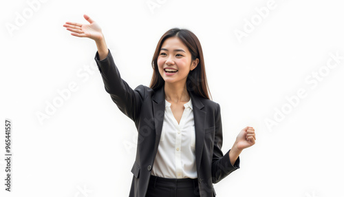 A confident businesswoman gesturing during a presentation, showcasing professionalism and engagement in a corporate setting.