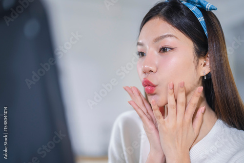 A confident, cheerful Asian woman smiles warmly as she looks at herself in the mirror at home, embracing self-love, inner strength, and positivity through daily self-care and personal empowerment.