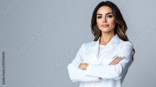 A confident female pharmacist stands with her arms crossed, wearing a white lab coat and smiling against a grey background.